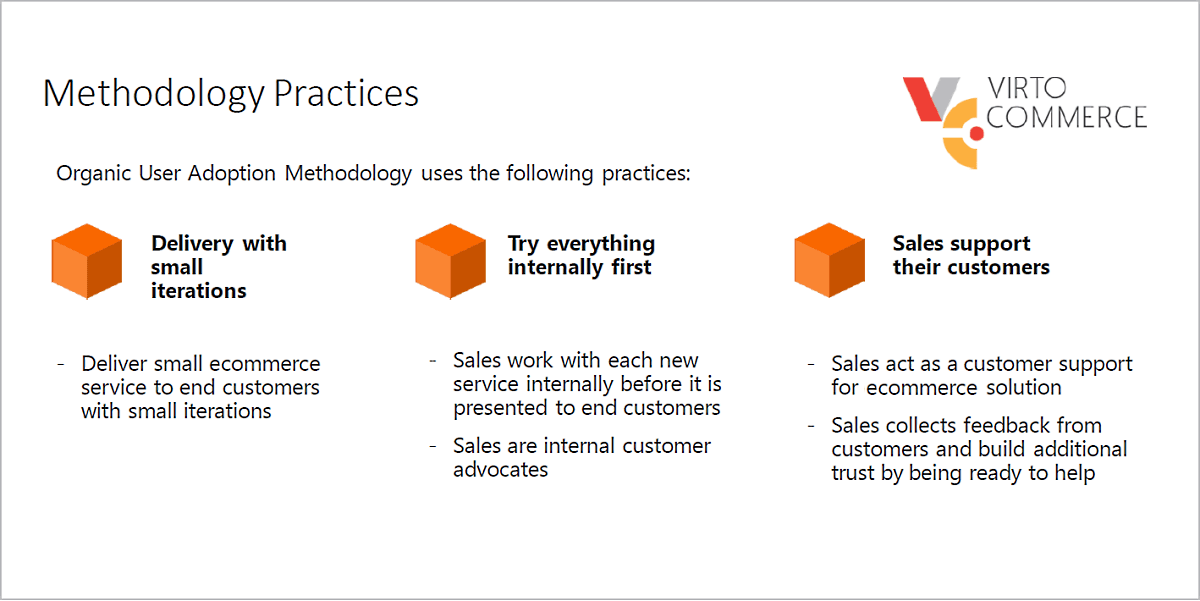 “ The proposed user adoption strategy is universal, but its implementation is onlypossible on a platform that allows you to run ecommerce services independently. Not all platforms have this functionality. We are delighted to say that with headless, composable and microservices, Virto Commerce can do this.”