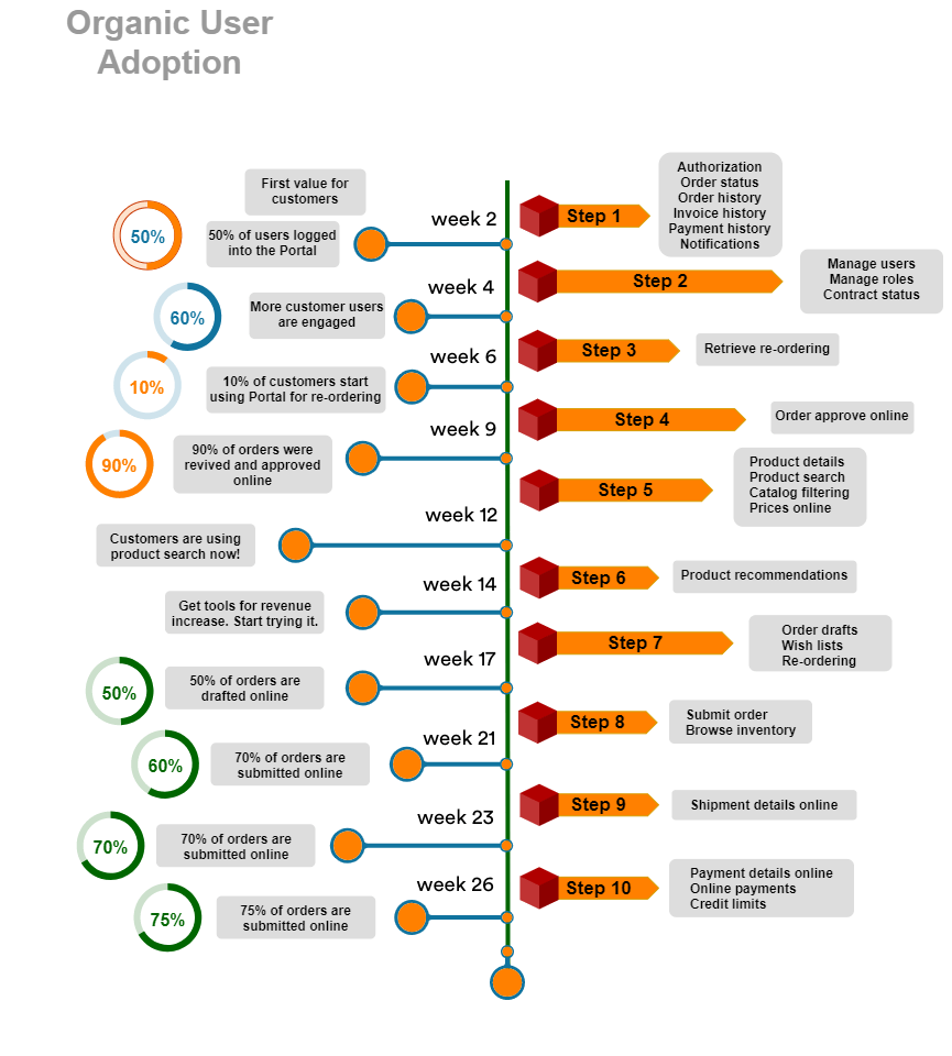 “ Aside from negative customer experiences due to shocked user adoption, if a company creates a B2B portal from start to finish behind the curtain, and only then presents it to customers, the company is also thereby delaying the achievement of B2B ecommerce benefits, which can already be achieved at the intermediate steps of user adoption.”
